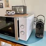 Les équipements de cuisine de cette villa Longere Coeur De Village Proche Des Plages comprennent un micro-ondes, une bouilloire électrique et un réfrigérateur, fournis dans un coin repas extérieur.
